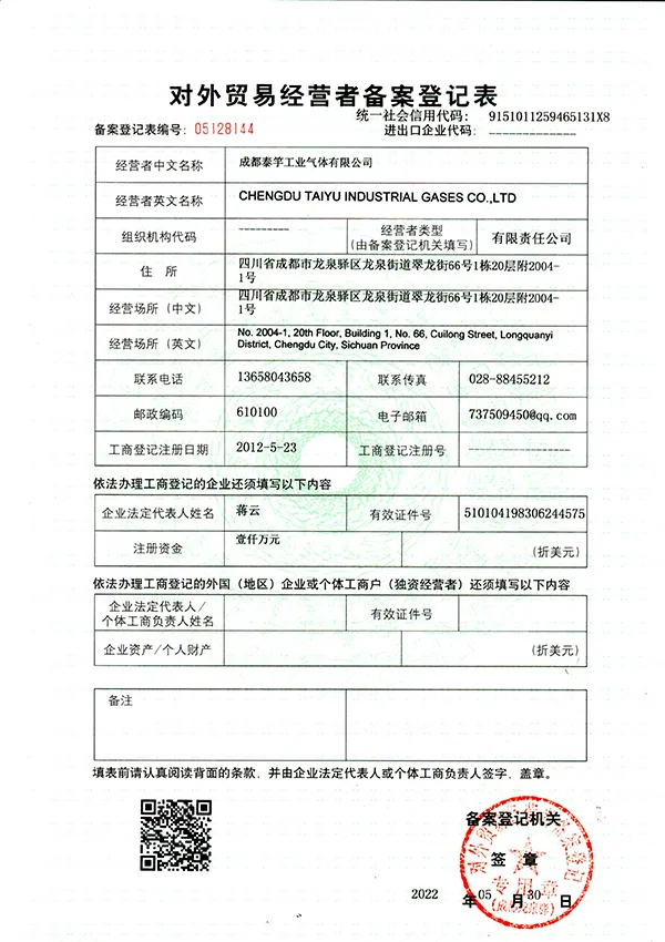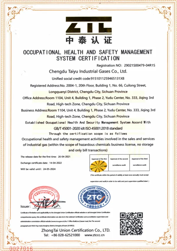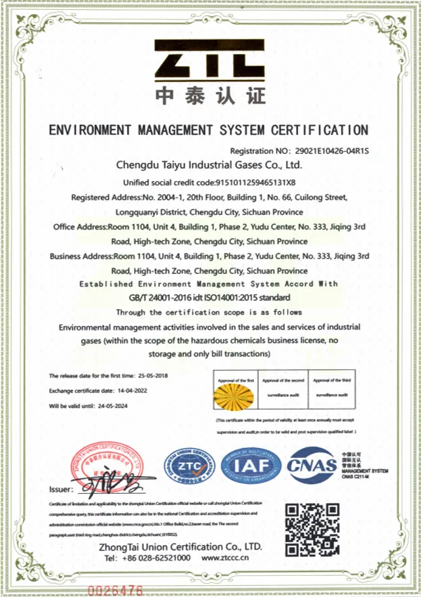 Chengdu Taiyu Industrial Gases Co., Ltd, established in 2002, is a manufacturer specializing in the production, research, and sales of various rare gases, industrial high-purity gases, specialty gases, electronic gases, and standard gas mixtures. We conduct research and development of gas products according to customer needs. Our range includes rare gases such as xenon (Xe), krypton, neon, argon gas (Ar), and helium (He). Industrial high-purity gases cover various purities and specifications, including hydrogen (H2), oxygen (O2), Carbon dioxide (CO2), acetylene (C2H2), and more. Specialty gases encompass various purities and specifications, such as sulfur hexafluoride, hydrogen chloride (HCl), hydrogen sulfide, nitrogen dioxide (NO2), carbon monoxide, methane (CH4), ethane, ethylene, and others.